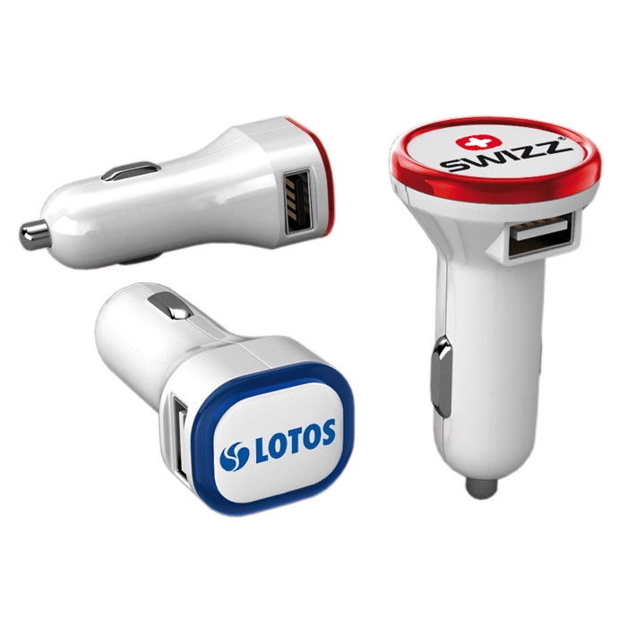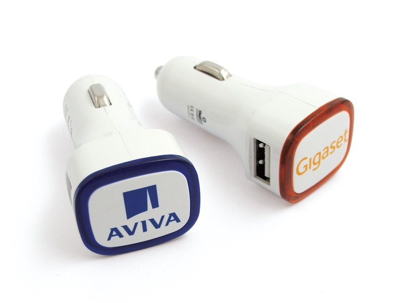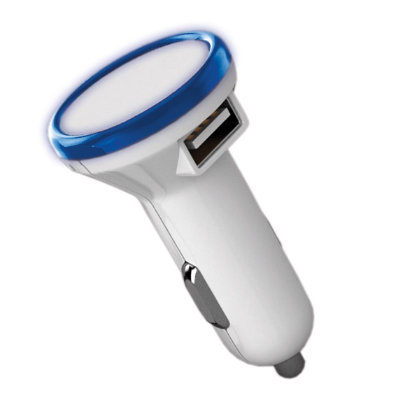 Elegancka, samochodowa ładowarka, do telefonów, tabletów i innych urządzeń posiadających wejście USB. Posiada 2 wejścia - białe do iPada, iPhona i czarne na pozostałe telefony, tablety. Zewnętrzny ring podświetlany LED, powoduje, że ładowarka jest doskonale widoczna. Dookoła ringu idealne miejsce na naniesienie logo. Na zamówienie dostępny również zestaw z kablem i wtyczką 230V w ozdobnym pudełku. Produkt wykonany ze szwajcarską precyzją na komponentach elektronicznych z USA.